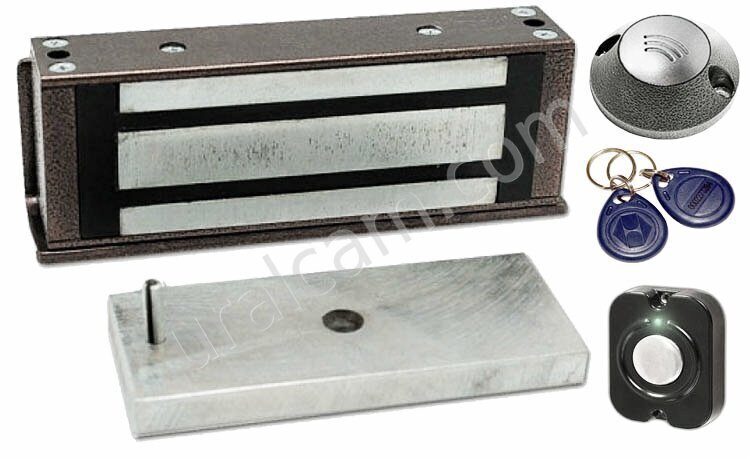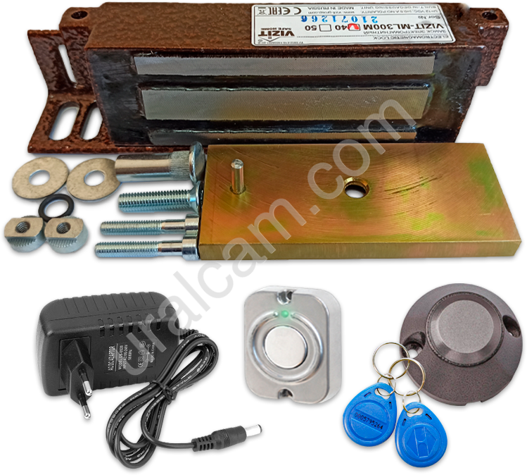 В комплекте: Замок магнитный, считыватель электронных ключей, металлическая кнопка выхода с подсветкой, надёжный блок питания, контроллер, ключ - 10шт.